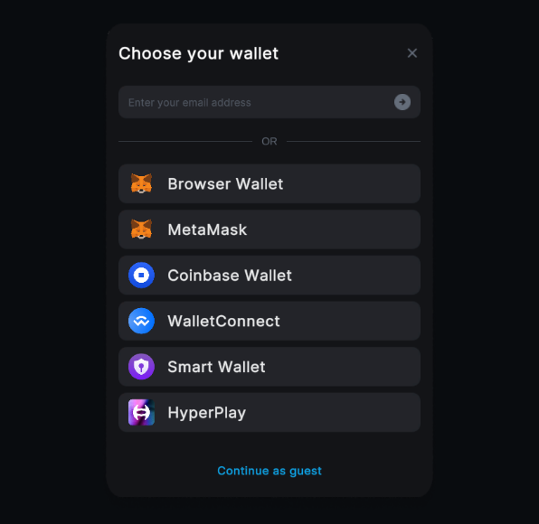 When a user clicks the button, a dropdown of supported wallets will appear. The user can then select their preferred wallet to connect to the game; once connected, the button will show the user’s balance and an option to switch networks if multiple networks are set up through the ThirdwebManager.